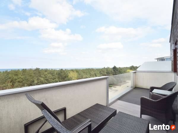 Zapraszamy Państwa do apartamentu z bezpośrednim widokiem na morze. Apartament dwupokojowy na ostatnim, IV piętrze z dużym tarasem, na frontowej ścianie budynku z bezpośrednim widokiem na morze, ponad drzewami, z oszałamiającym widokiem. Z przeszklonego tarasu rozpościera się urzekający widok na błękit naszego Bałtyku.